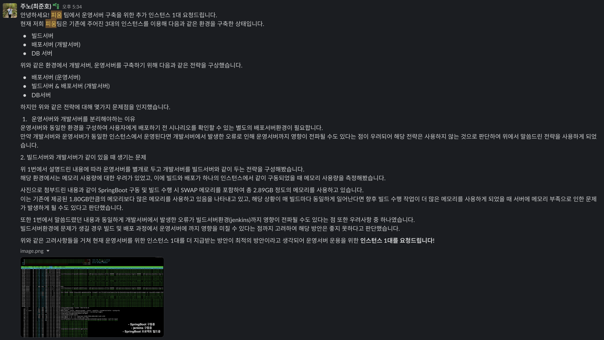 팀원들과 다양한 방안에 대해 이야기를 주고받고 난 결과 1대의 EC2를 추가적으로 요청하게 되었습니다.