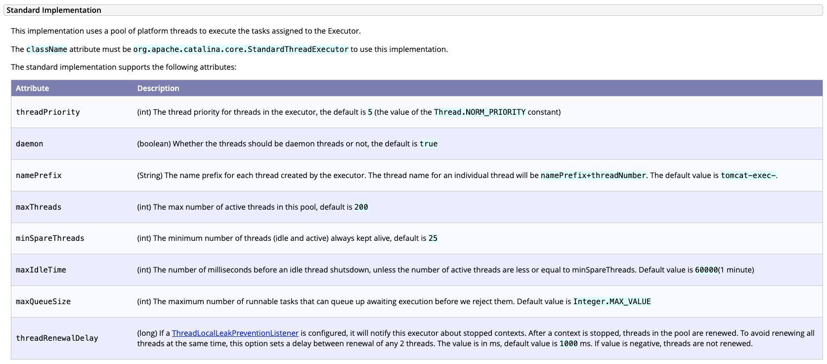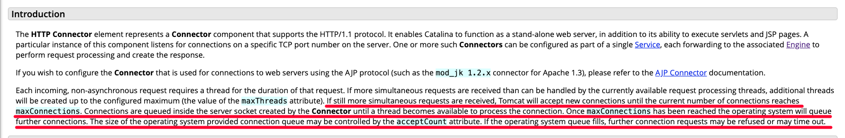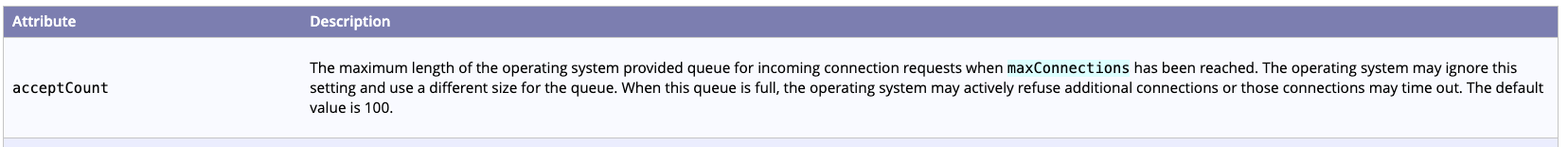 - acceptCount: 최대 연결 수에 도달했을 때 대기할 수 있는 추가 연결 요청의 최대 수다. 기본값은 100