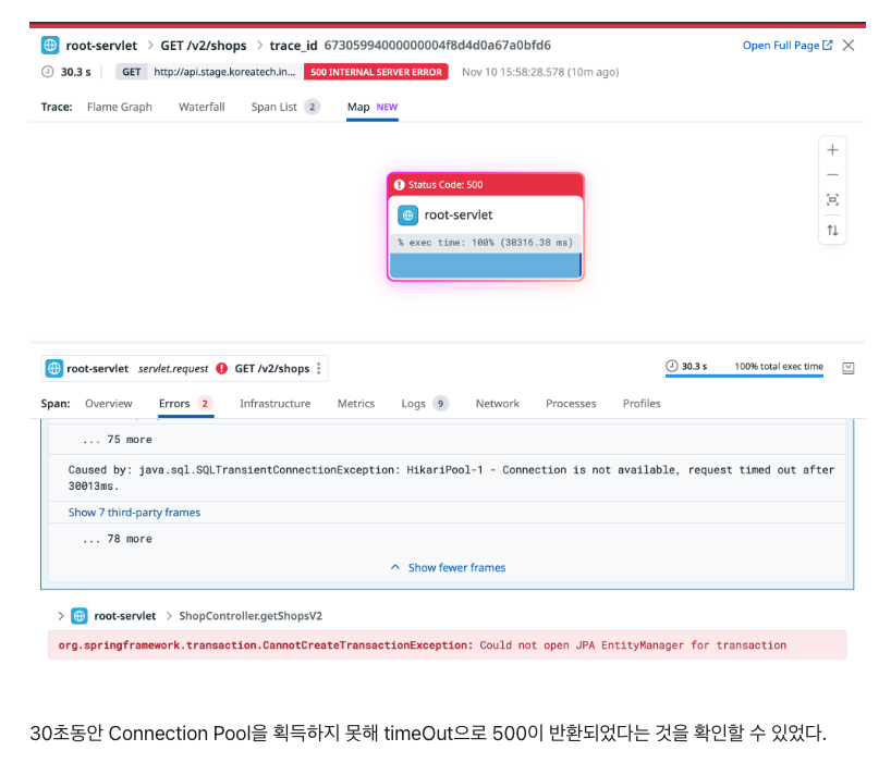 바로 이 connectionTimeout 설정으로 인해 30초동안 connection을 기다리다 나는 에러였음을 다시 확인해볼 수 있다.