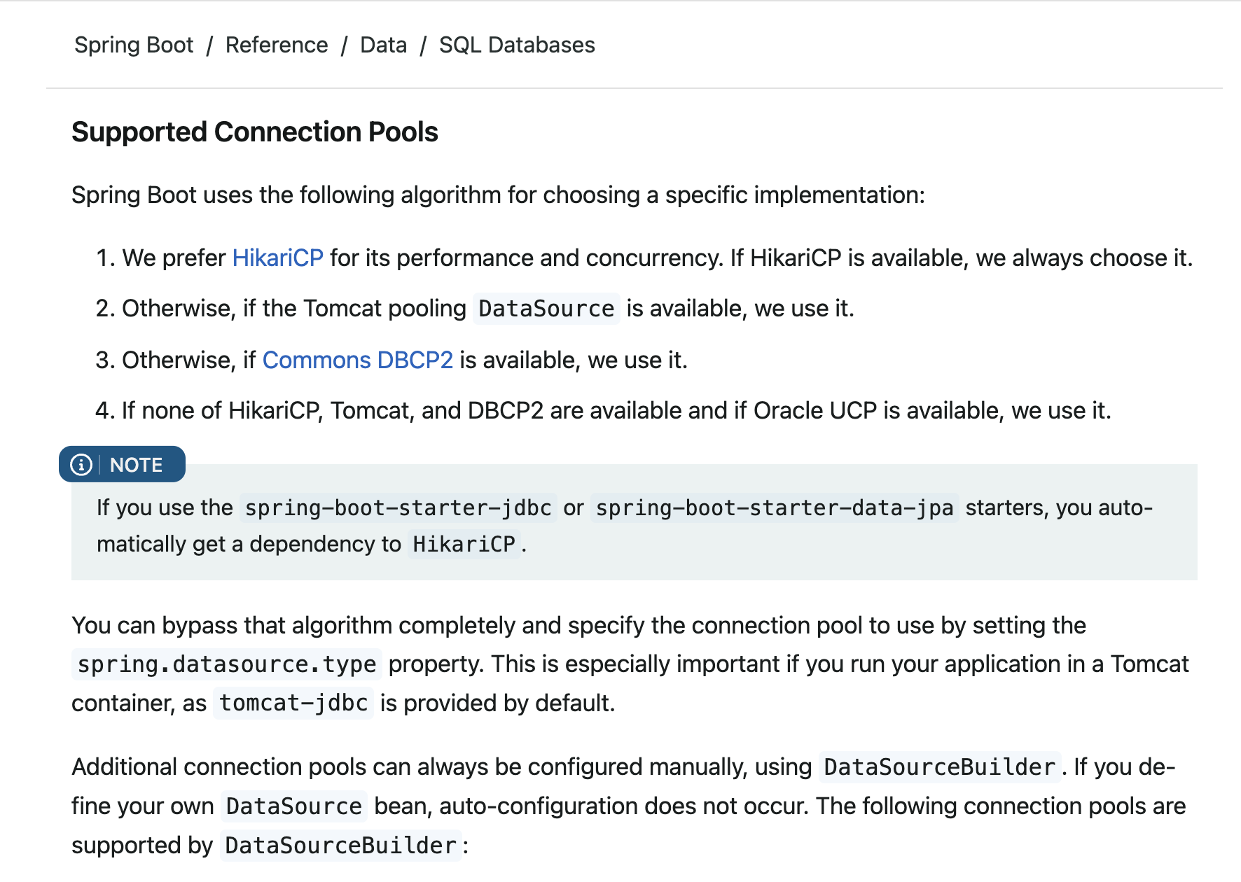 공식문서를 살펴보면 기본적으로 HikariCP를 사용하고, Tomcat, Commons DBCP2 순서대로 사용하고, 다 없다면 Oracle UCP를 사용한다고 명시되어있다. 역시 HikariCP가 잘만들긴 했나보다.