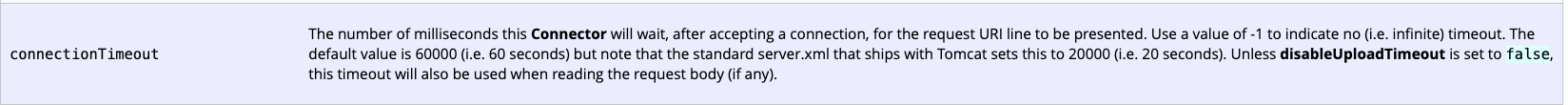 tomcat과 함께 제공되는 server.xml의 기본값은 20초라고 하는데 SpringBoot 내장 톰캣을 사용하니 여기서는 고려할 사항이 아니다.