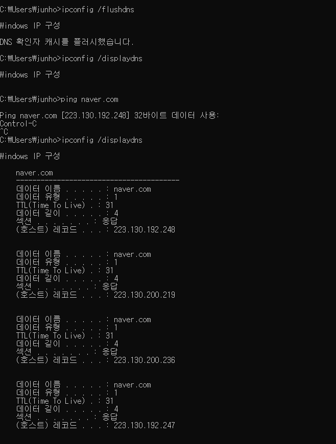 보기 편하게 ipconfig /flushdns 명령어를 수행해 캐시되어있는 dns를 비우고 확인을 해봤다.