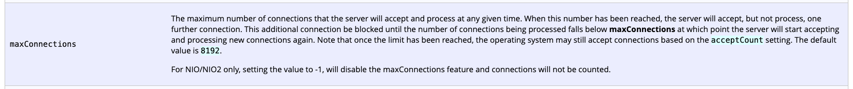 Once maxConnections has been reached the operating system will queue further connections. The size of the operating system provided connection queue may be controlled by the acceptCount attribute.
