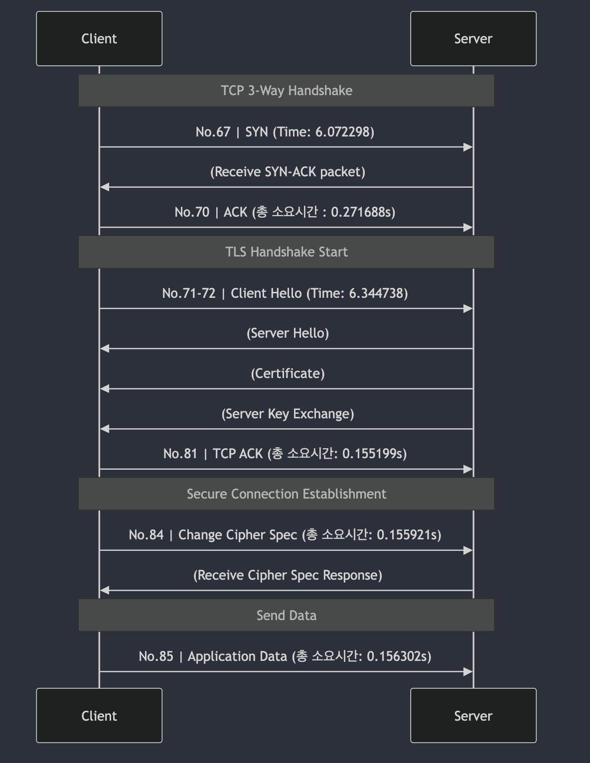3-way handshake의 시간이 0.27초 가량 소요되었고, TLS handshake는 0.15초가량 소요되었다.