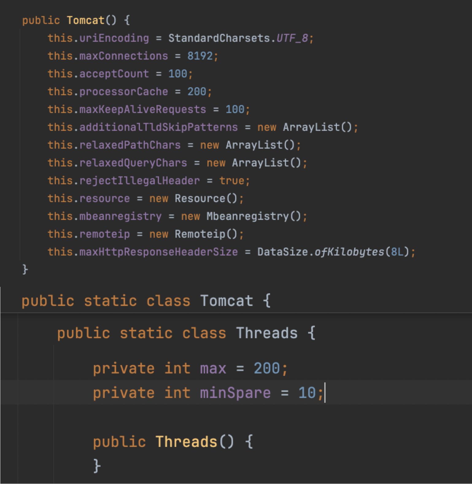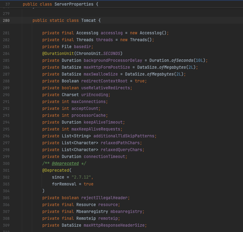 Spring Boot가 정의하고있는 Tomcat 클래스다! 아까 봤던 공식문서에 있는 값들이 정의되어있다.