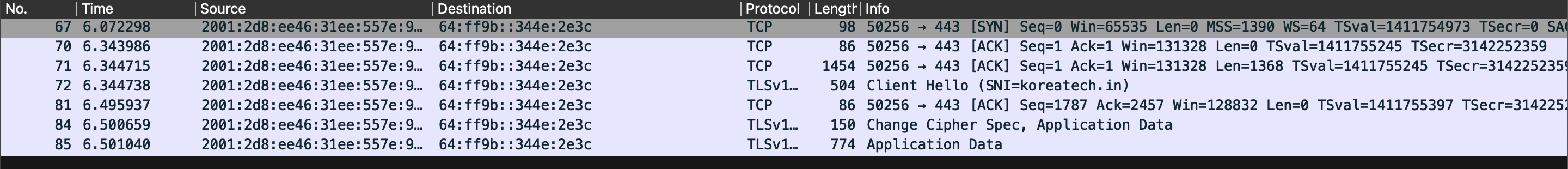 그 뒤에는 TLS Handshake가 시작된다. (패킷 No.71)