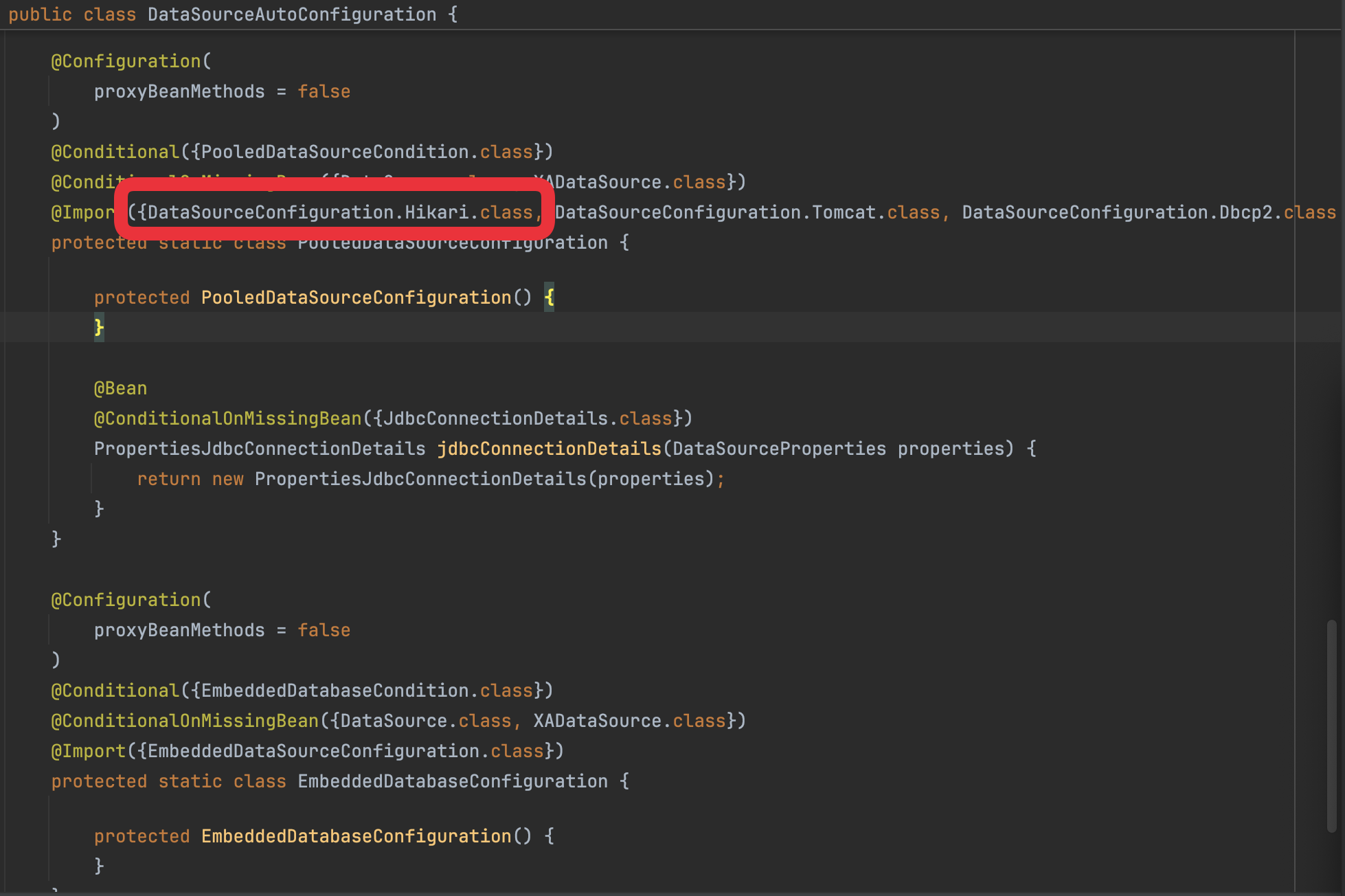 실제로 SpringBoot DataSourceAutoConfiguration 코드를 살펴보면 공식문서에서 설명한 순서대로 Import가 구성되어있는 것을 볼 수 있다.