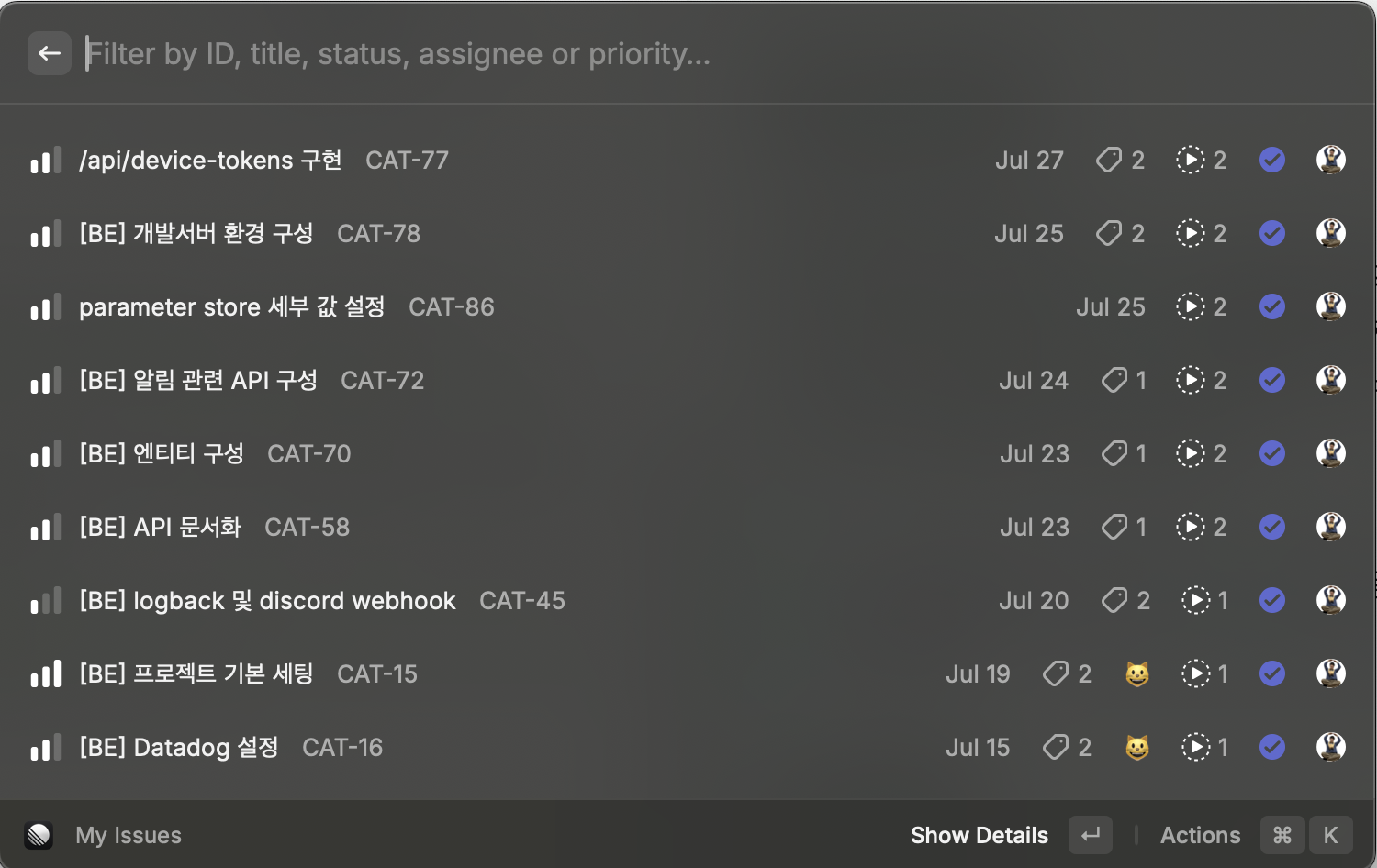 최근에 필립한테 소개받은 Raycast랑 연동해서 빠르게 할당된 이슈를 확인하는데 빠르게 확인할 수 있어서 만족스럽다.