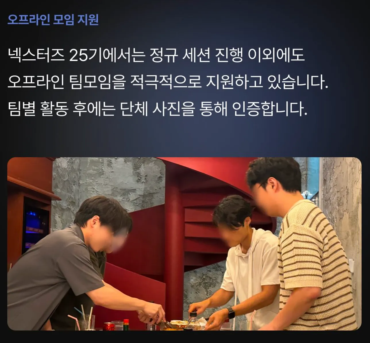 첫 회식에서 지훈이랑 상운이가 테이블이 옆팀과 같이 앉아서 두개의 대화가 겹쳐서 결국 둘다 못듣고 계속 전달받았던게 생각난다 🤣