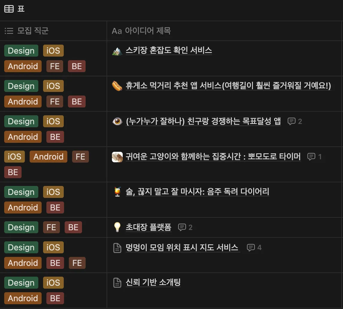 넥스터즈에서는 아이디어를 발제하는 사람이 PM이 되어 팀원을 모집한다. 아직 머릿속에서 해결하고싶은 아이디어가 없던 나는 기획에 참여하는 포지션에 임했다. 발안된 기획들을 둘러보는데 기획들이 모두 특색있고 재밌어보였다!!