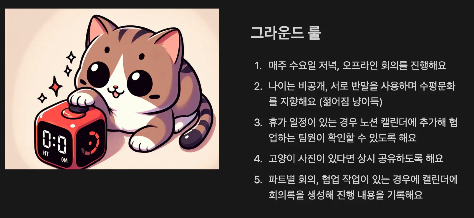 GPT 선생님께 부탁해서 귀여운 팀명에 맞게 귀여운 고양이사진을 만들고 우리 팀 작업 노션 배너로 설정했다.