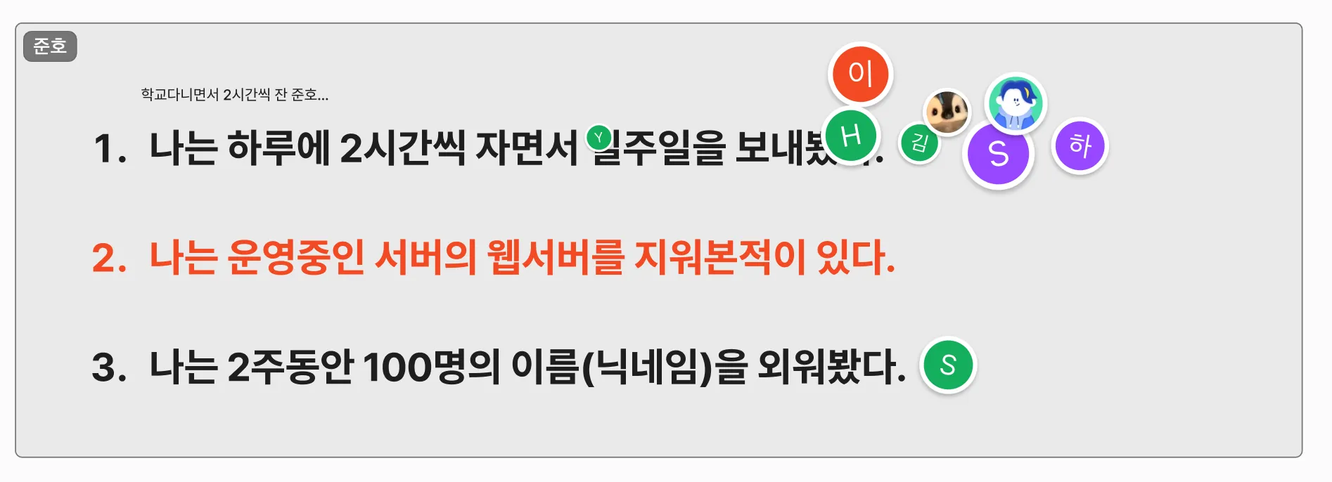 처음에는 진진가 게임을 하면서 서로에 대해 알아가는 시간을 가졌다 :) 즐겁기도하고, 웃프기도한 일화를 서로 이야기하면서 서로에 대해 어느정도 알 수 있는 재밌는 시간이였다.