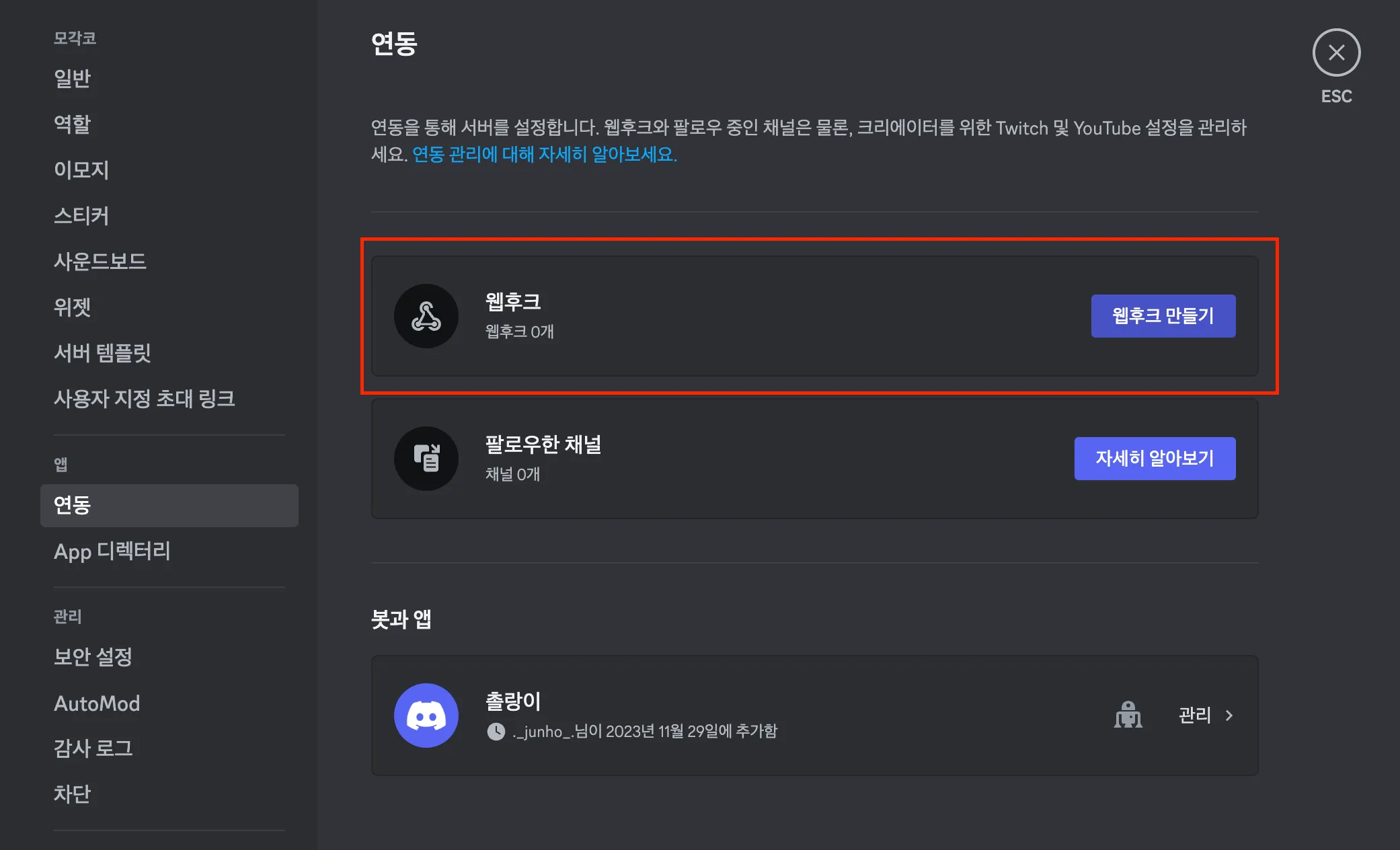 디스코드 웹훅 채널 추가