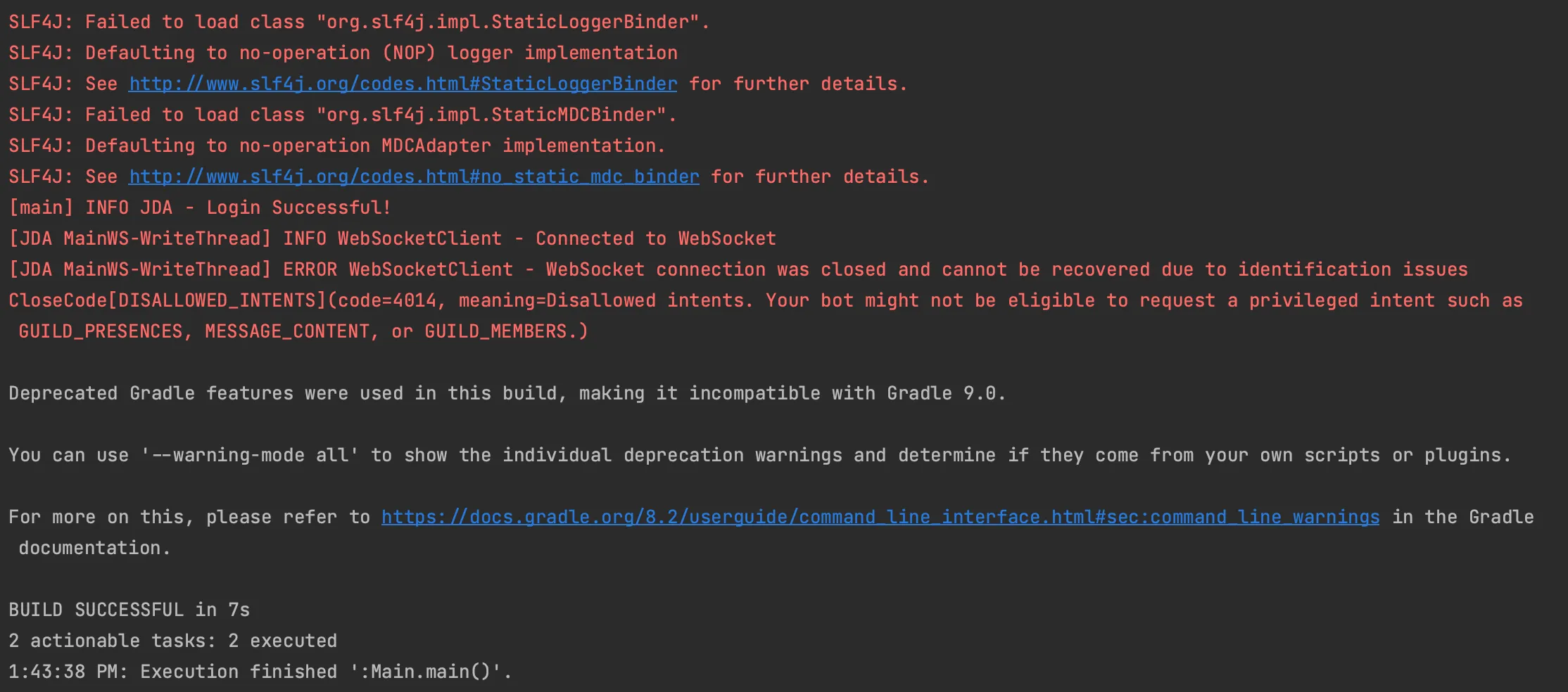 [JDA MainWS-WriteThread] ERROR WebSocketClient - WebSocket connection was closed and cannot be recovered due to identification issues