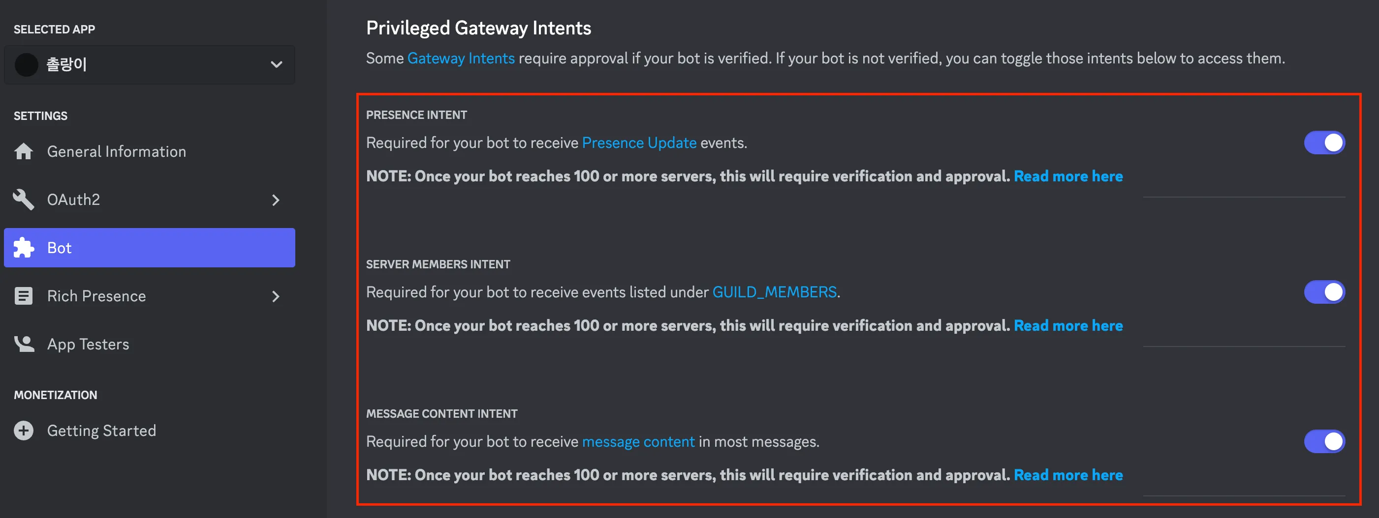 디스코드 개발자 도구로 들어가서 다음 옵션들을 활성화시켜줘야한다.