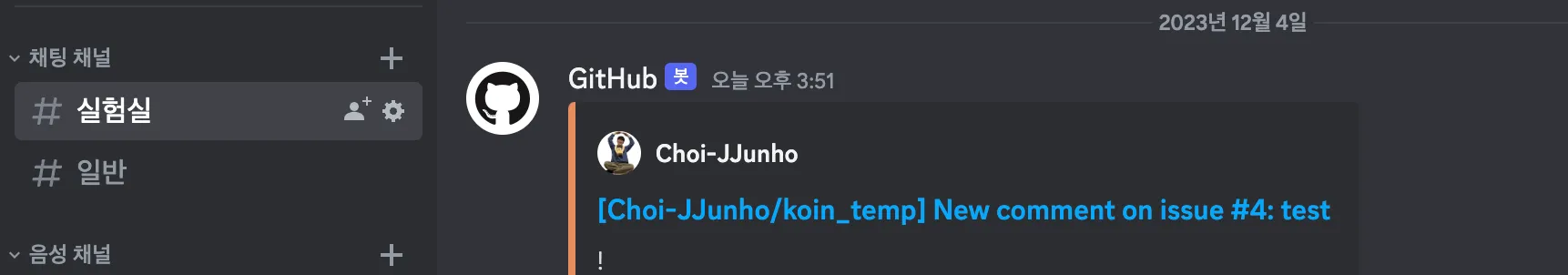 설정을 완료하면 추가한 이벤트에 따라 채널에 메시지가 오는 것을 확인할 수 있다.