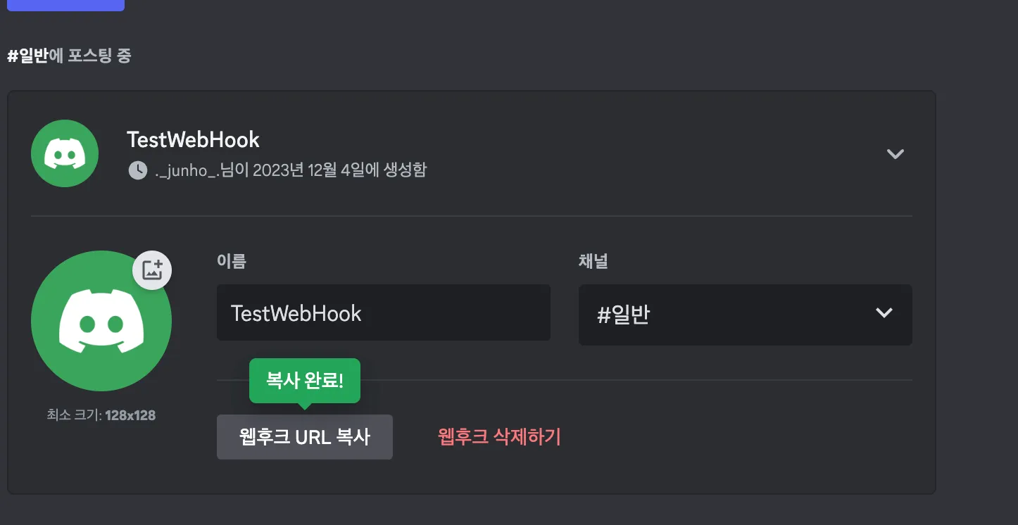 웹후크 추가 후 웹 후크 URL을 복사한다.