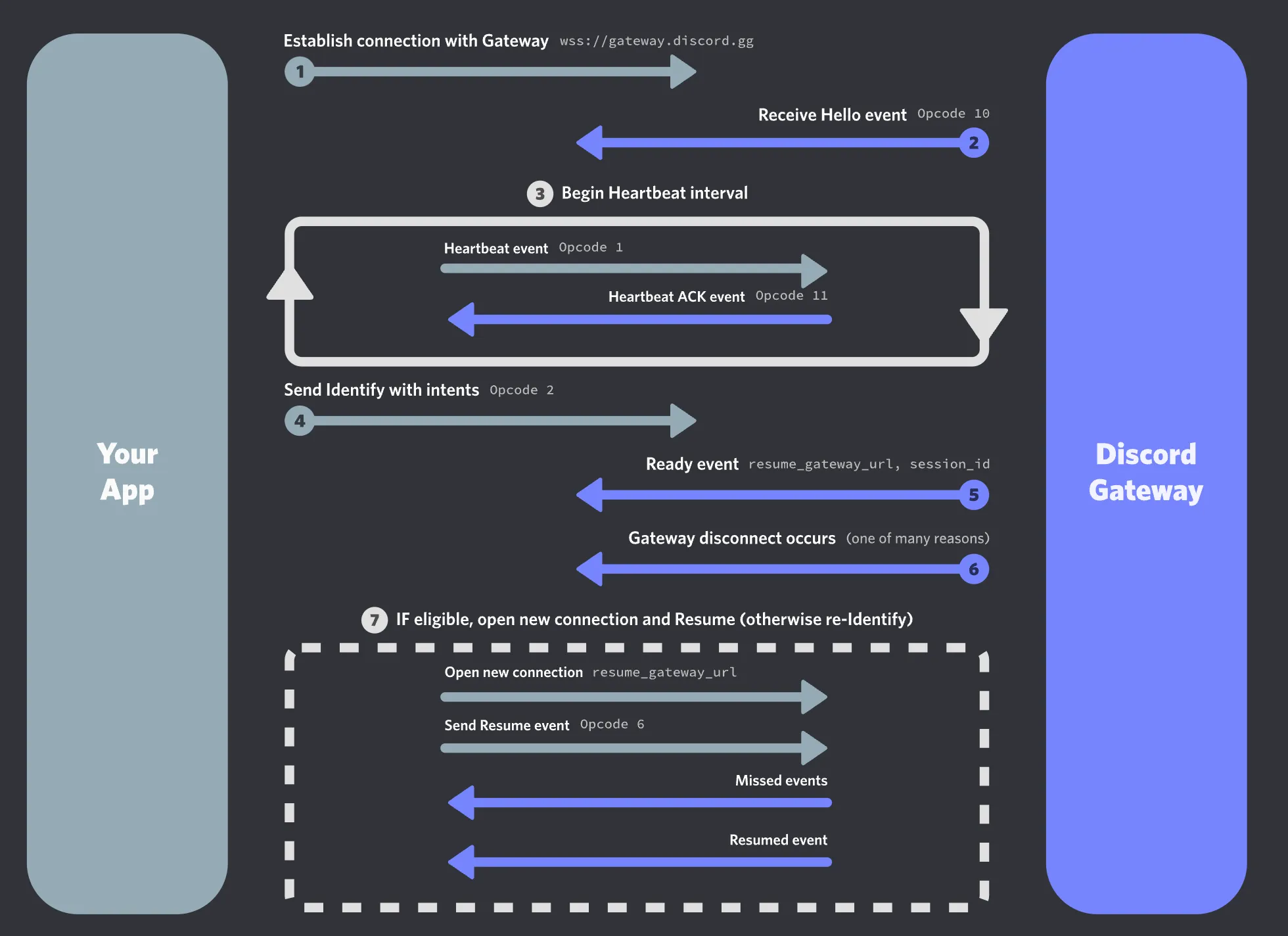 대락적으로 아래와 같은 형태로 통신이 이뤄지는데 App이 discord Gateway로부터 요청을 받고, 보내는 과정에서 몇몇 권한이 필요하다.