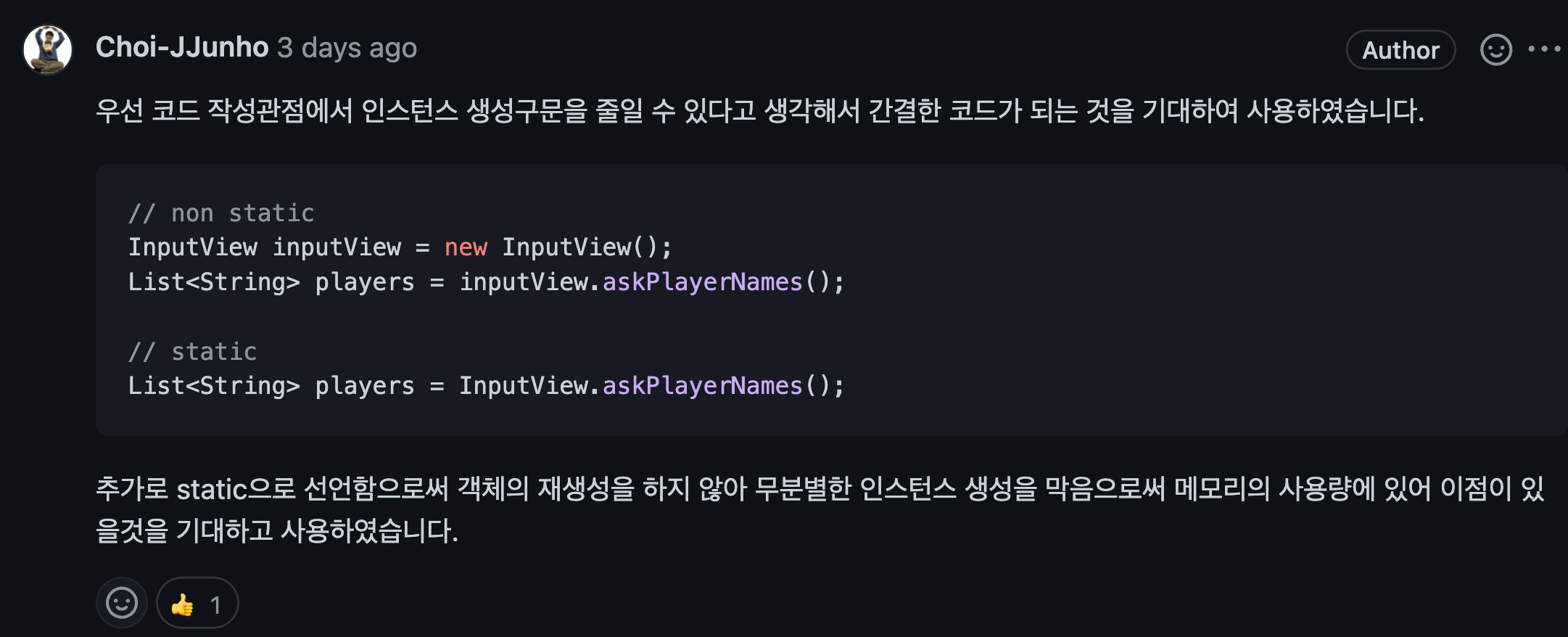 InputView, OutputView의 메소드를 static으로 구성했다. 리뷰어 토미가 이 부분에 왜? 라는 질문을 주었을 때 다음과 같은 답변을 했다.