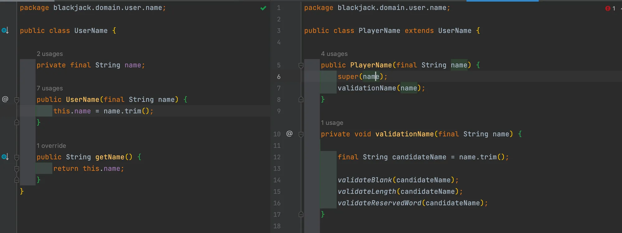 PlayerName이라는 객체에서 validationName(name) 메소드를 먼저 수행한 뒤 super(name) 을 통해 생성자 주입을 하려고 했다.