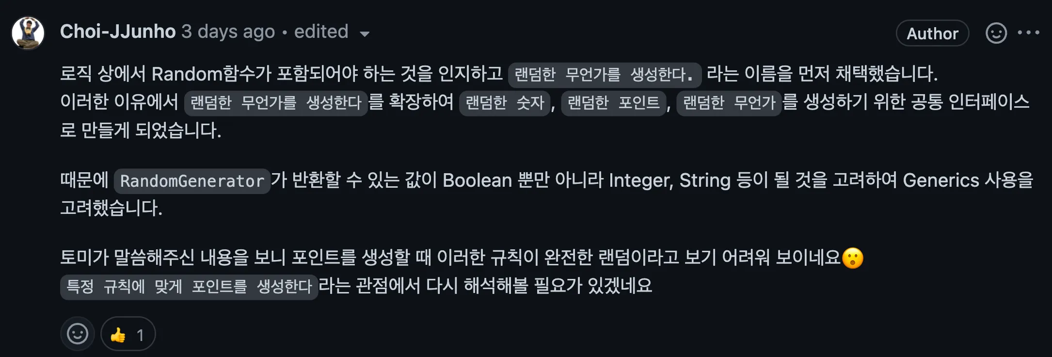 어떤 랜덤한 값을 만드는 일을 수행하는 인터페이스 RandomGenerator를 만든 뒤 이를 구현하는 RandomBooleanGenerator를 만들어 랜덤한 Boolean값을 생성하는 로직을 구성했다.