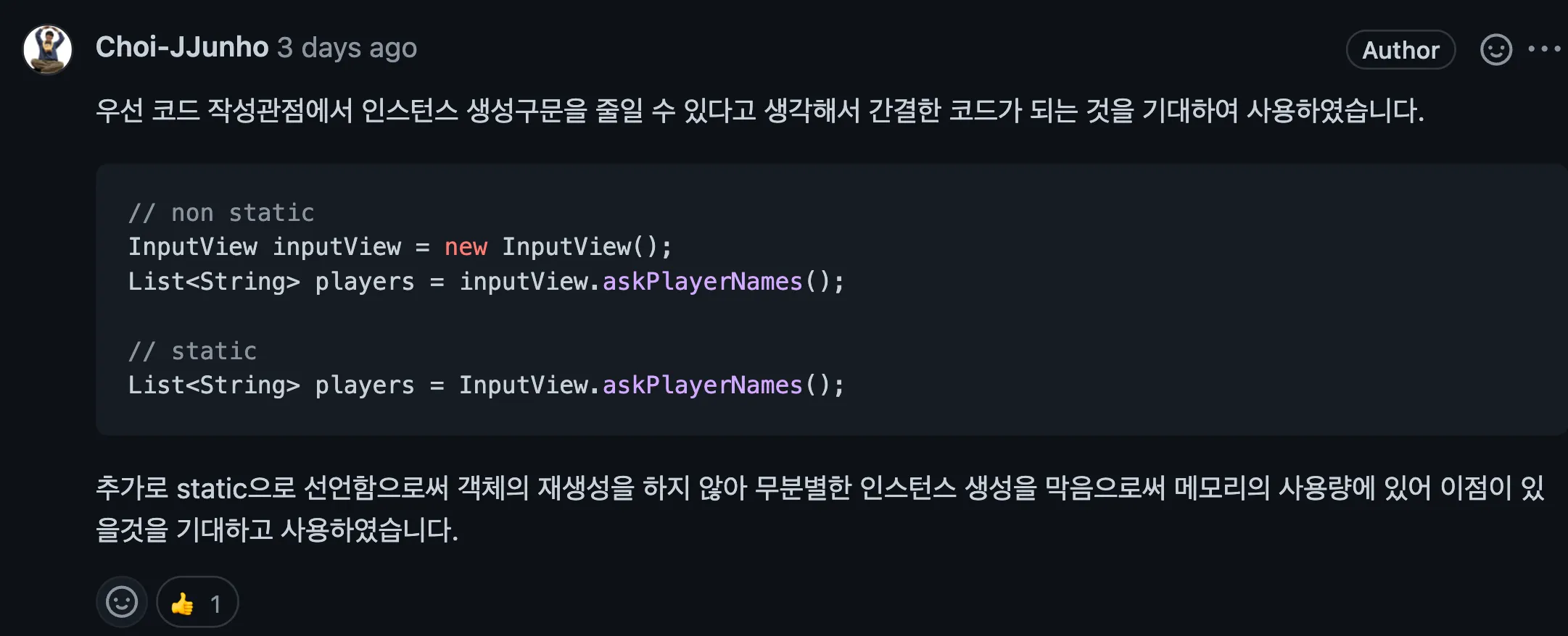 InputView, OutputView의 메소드를 static으로 구성했다. 리뷰어 토미가 이 부분에 왜? 라는 질문을 주었을 때 다음과 같은 답변을 했다.