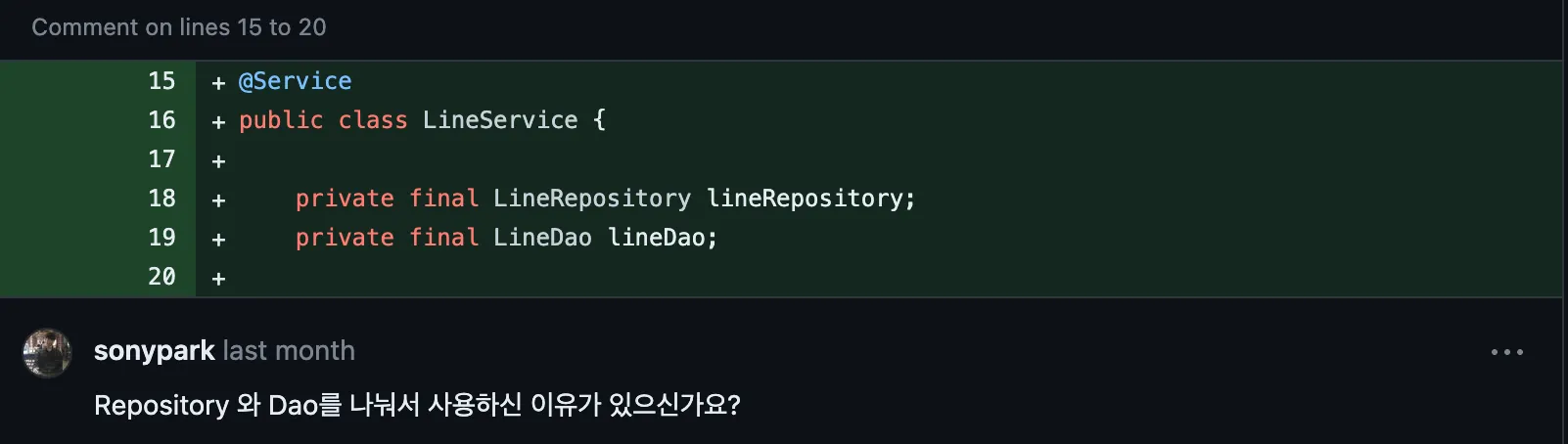 하나의 Domain을 만들어주려면 여러 테이블의 정보를 조회해서 조합을 해야하는데 이 행위를 특정 Dao가 가지기에는 �Dao가 상호 의존하게 되는 문제가 발생했습니다.