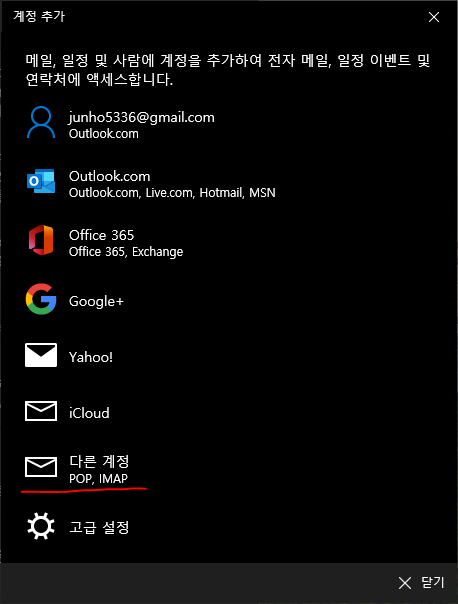 계정을 추가할 당시의 상황으로 돌아가보면 추가할 때 다른계정 (POP, IMAP)을 선택했었다.