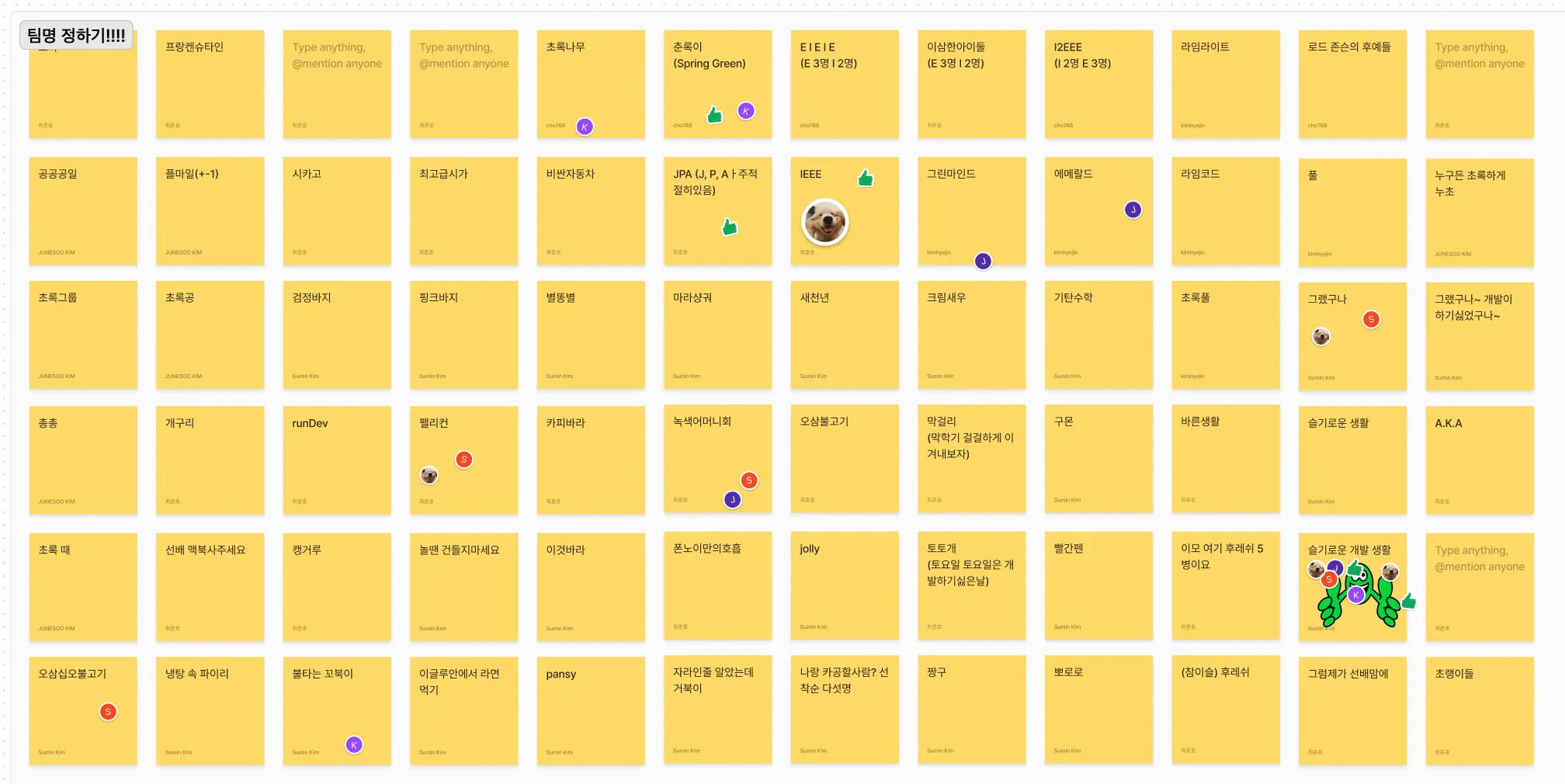 별건 아니지만 (사실 매우 중요) 팀명을 정해두면 좋을거같아서 팀명도 정했다. 5분동안 브레인스토밍으로 쭉 뽑아내고 투표로 정했다.