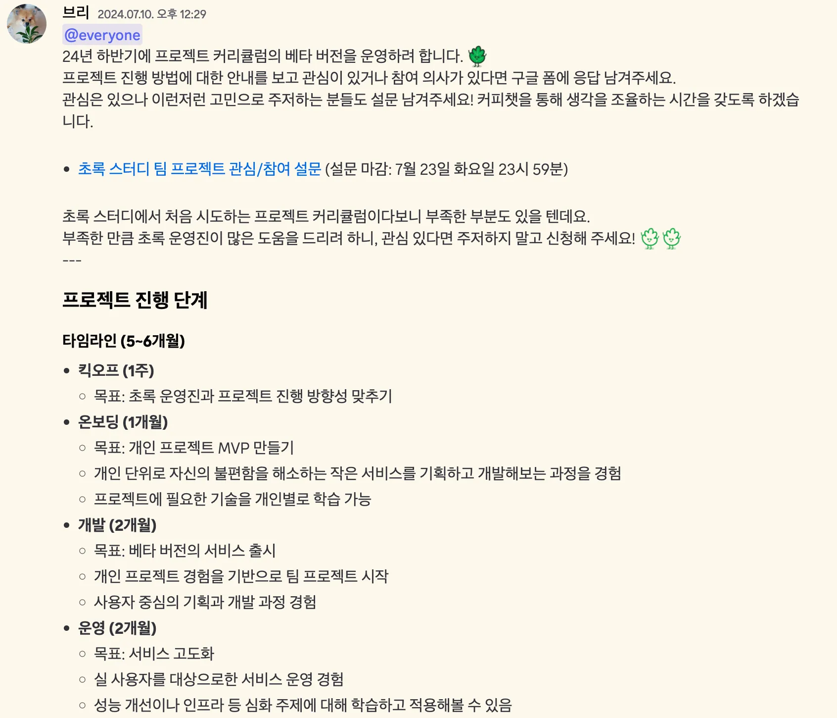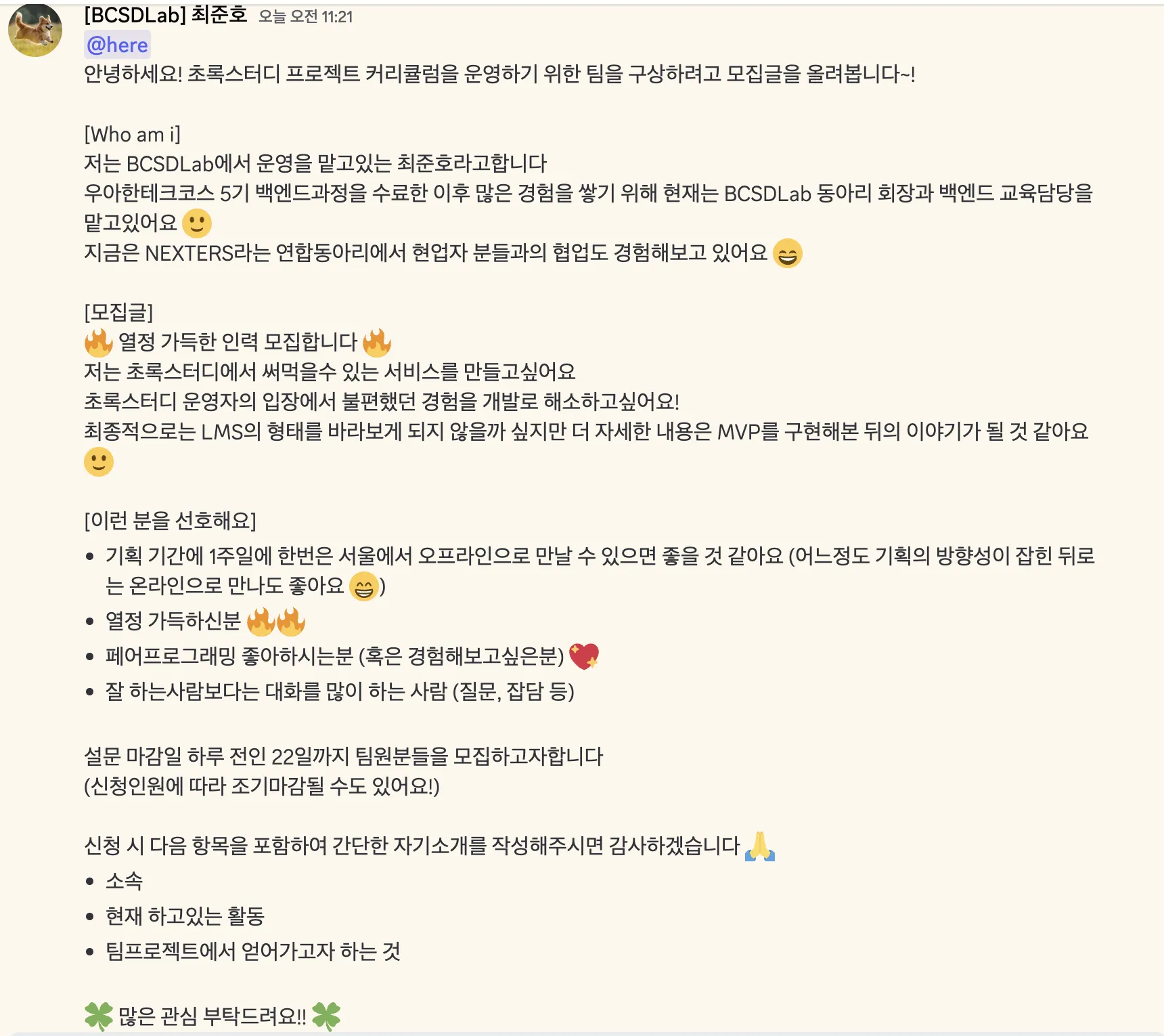 오프라인 밋업 이후 얼마 안있어 초록스터디 공지채널에 공지가 하나 올라왔다.