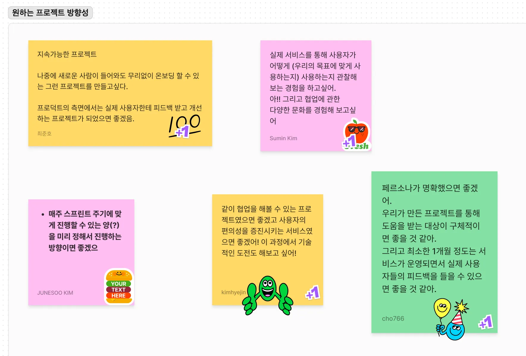 Figjam을 활용하여 프로젝트 방향성을 서로 이야기하는 시간을 가졌다. 한명씩 이야기하면서 본인이 이 프로젝트에서 무엇을 얻어가고싶고, 어떤 흐름으로 진행되길 원하는지 공유하는 시간을 가지면서 앞으로 팀이 바라봐야할 방향성을 생각해볼 수 있었다.