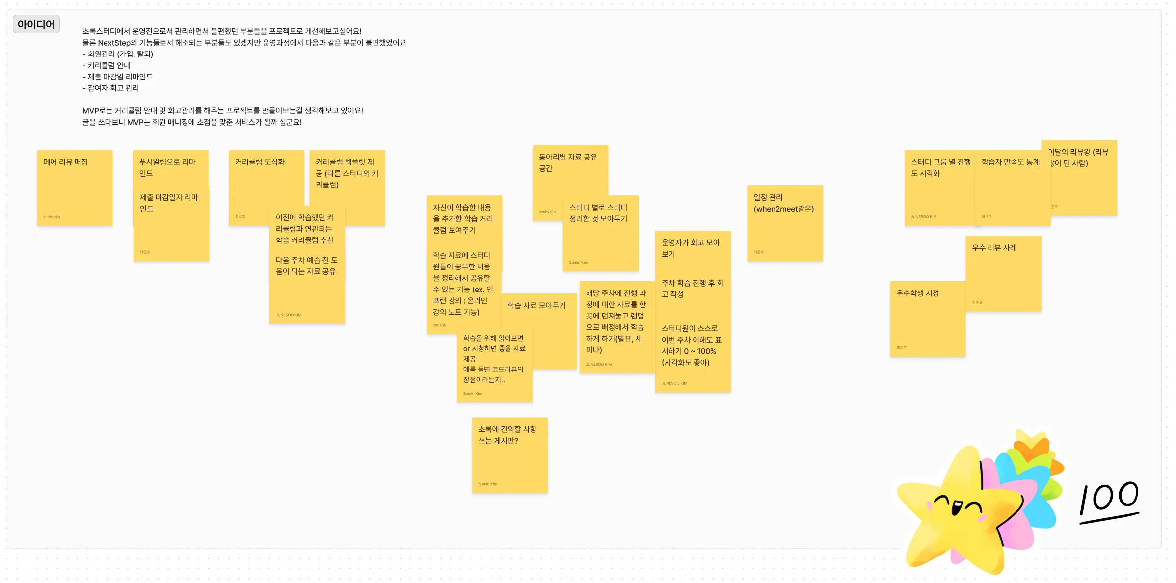 약 15분간 진행했던거같은데 정말 다양한 기능, 기획들이 나왔다. 사실 이 기능, 기획을 목표로 구현을 할 것은 아니다. 이것들은 우리가 느끼는 불편함 혹은 기능이라고 생각하기 때문에 발안된 내용들을 토대로 설문을 만들어서 사용자들에게 페르소나에 부합하는 인원들을 대상으로 설문을 돌려보는 것을 해보려고한다.