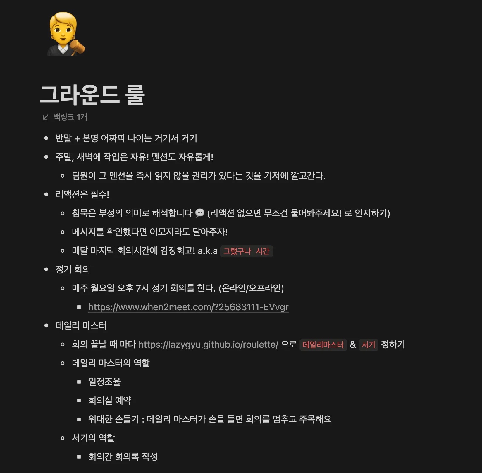 이후 그라운드 룰은 우테코에서 했던 피움팀의 그라운드 룰🌱을 가져와봤다.