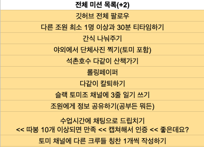 데일리 팀원들이 서로 친해질 수 있도록 다같이 다양한 미션들을 준비해보는 시간을 가졌어요! 레벨 2동안 미션들을 수행하면서 데일리 팀원들과 많이 친해져봐야겠네요 👍