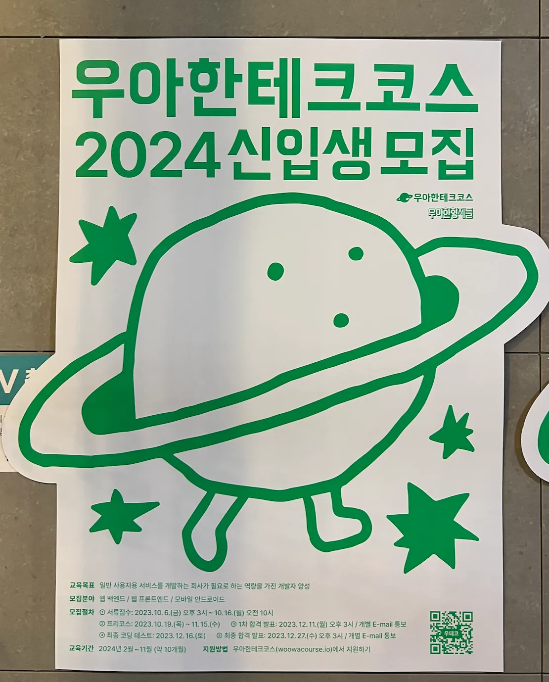 우테코 6기 모집공고가 캠퍼스 여기저기 걸려있네요~! 새로운 캐릭터(목성인가..💫)도 귀엽네요 ‘O’