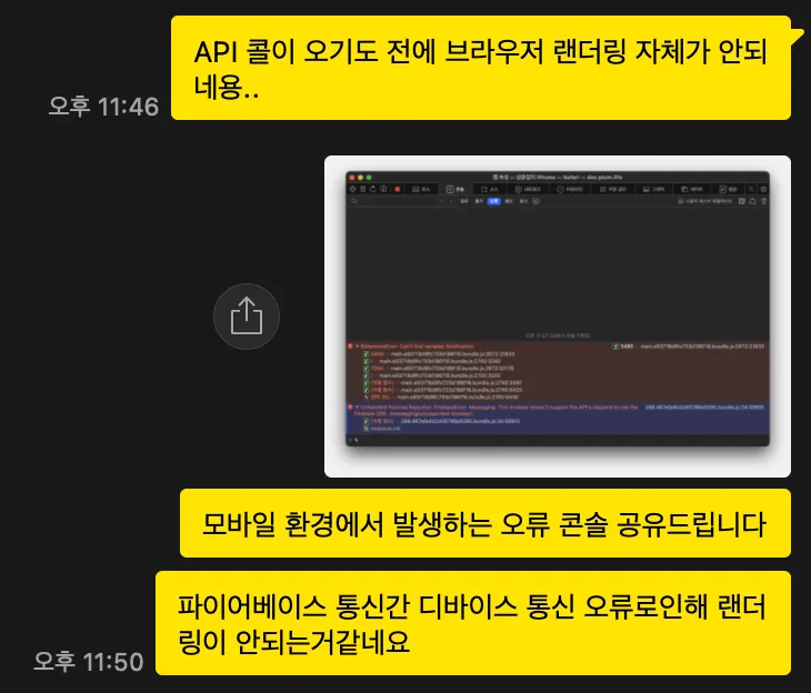 집에 가면서 개발서버 QA를 해보려고 핸드폰으로 피움 개발서버를 딱 켰는데… 하얀 화면만 나오고 브라우저 랜더링이 안되지뭡니까~ 하핫..