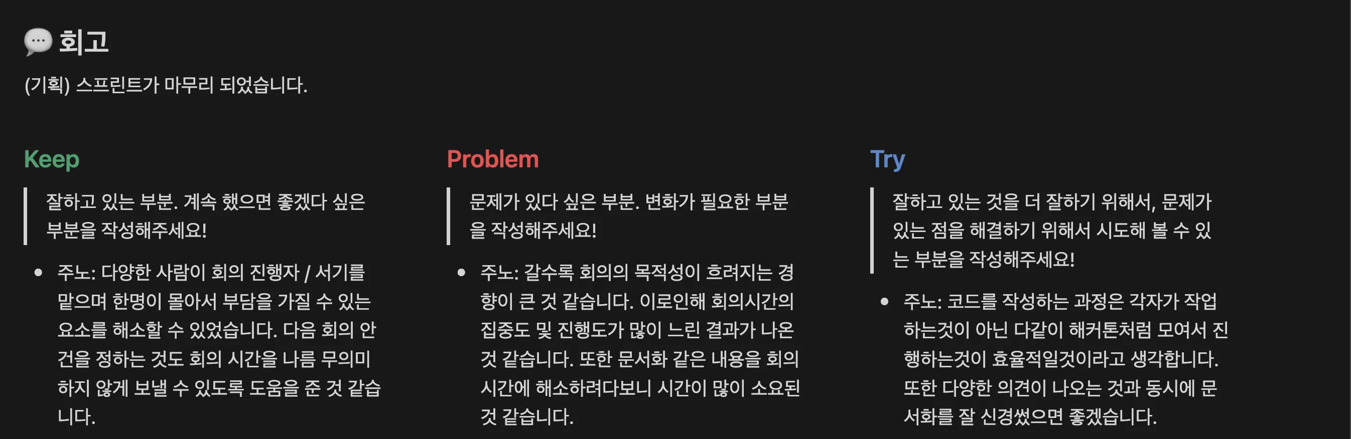 이번 스프린트는 구현에 대한 시작을 하지 못하고 기획에 대한 협의만 이뤄졌습니다. 무엇이 문제였고 무엇을 지속해야할지 회고를 통해 돌아보는 시간을 가졌습니다