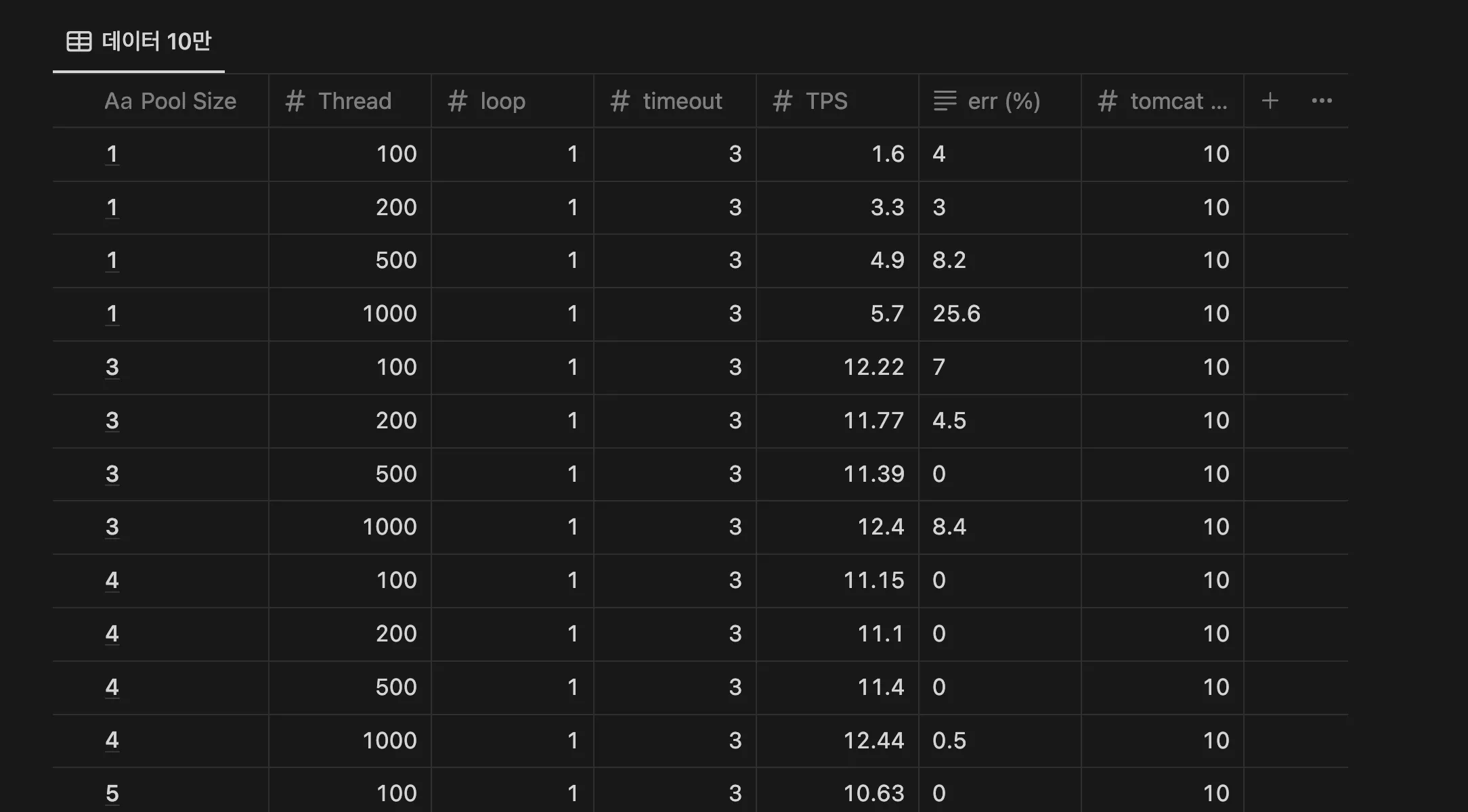 공식에 따르면 약 4~5개정도의 Connection Pool의 개수가 최적이라고 했지만 실제로 눈으로 보기 전까지는 모르는법이기에 다양한 값으로 테스트를 진행했습니다.