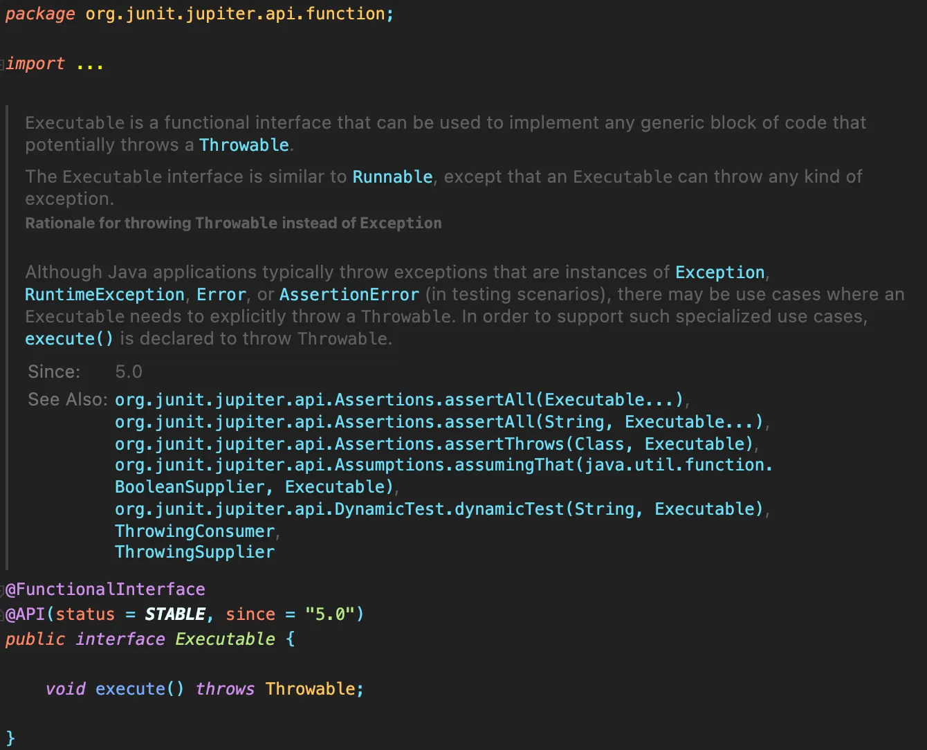 Executable은 JUnit5에 정의되어 있는 함수형 인터페이스이다. Runnable을 예외를 던질 수 있도록 재정의한 클래스라고 생각하면 된다.