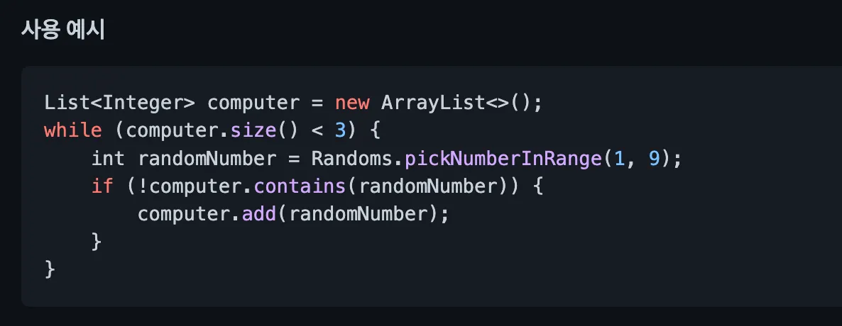 camp.nextstep.edu.missionutils.Randoms의pickNumberInRange()를 활용한다. - 사용자가 입력하는 값은