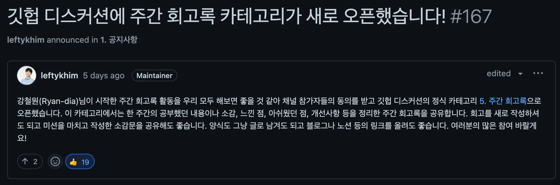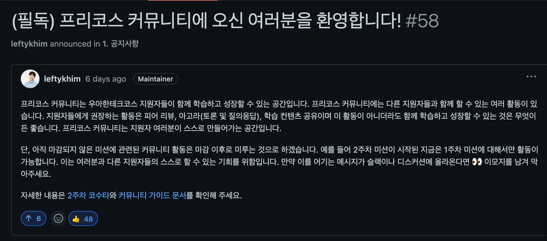 2주차가 시작됨과 동시에 github discussion도 열렸다.