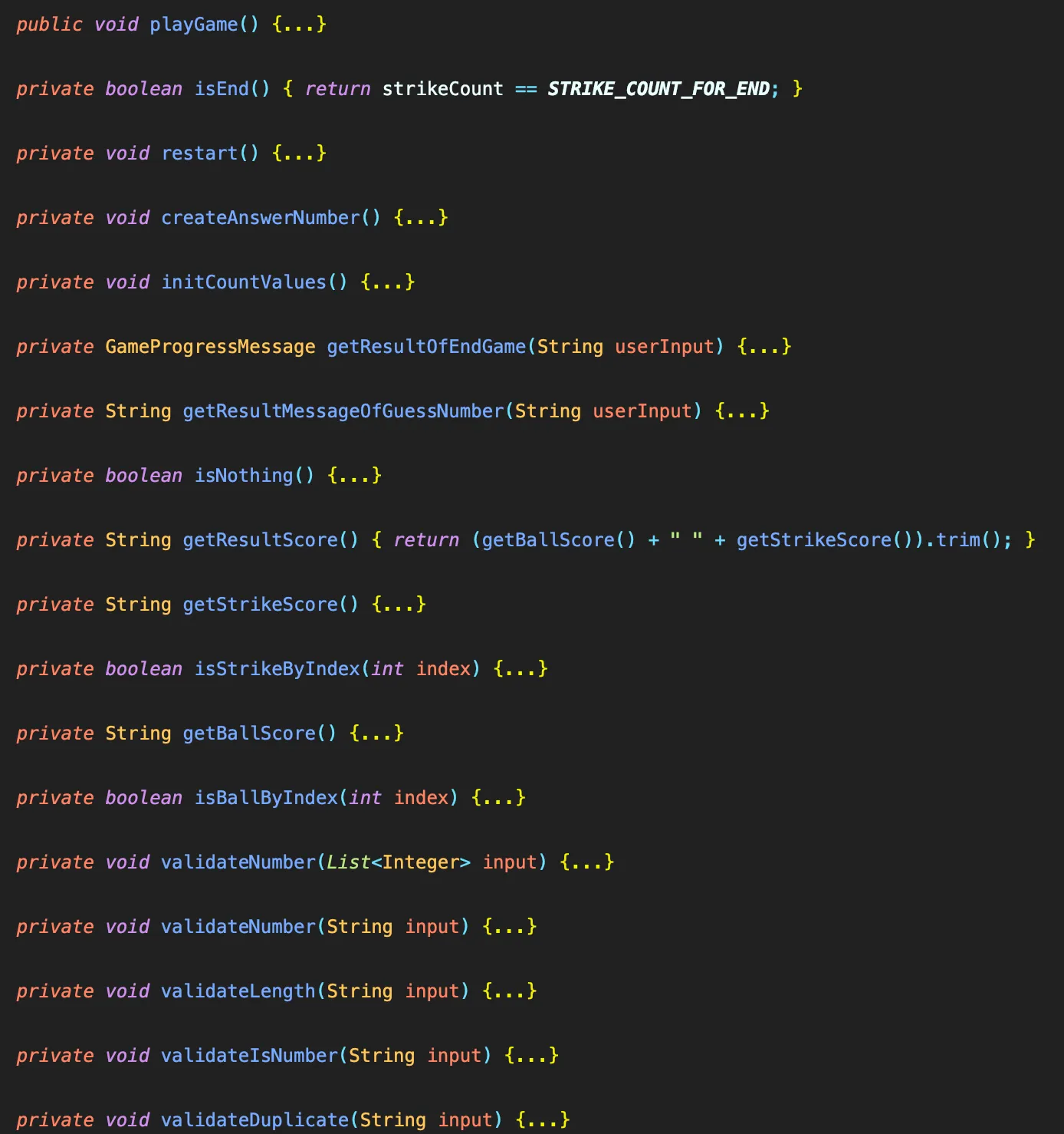 구현 함수를 모두 하나의 객체에 private 함수로 구현한 바람에 Reflection을 이용한 방법을 사용하지 않으면 테스트를 진행하기가 어려웠다.
