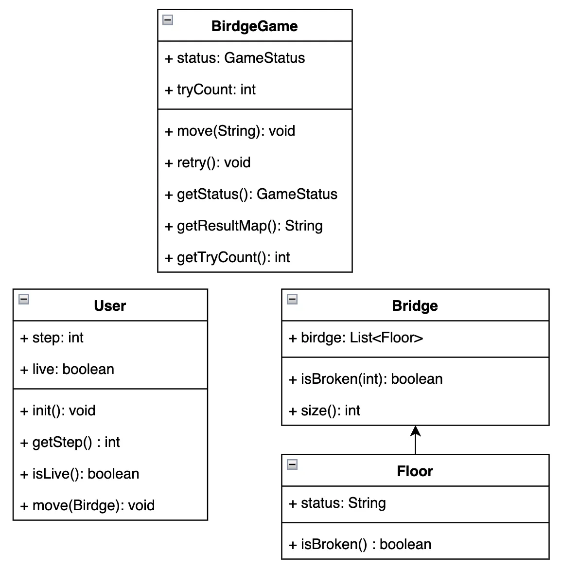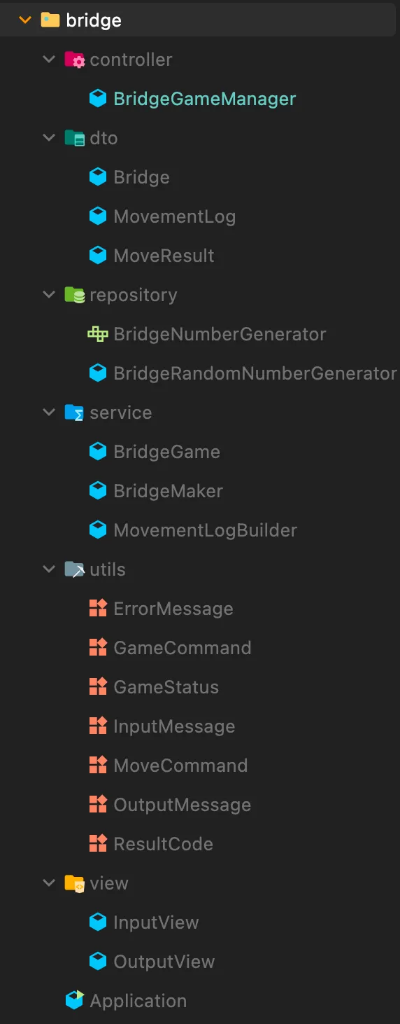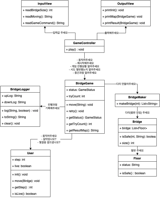 BridgeGame은 위 객체들에게 질문을 던져가며 게임을 진행하는 중재자 역할로 보자.