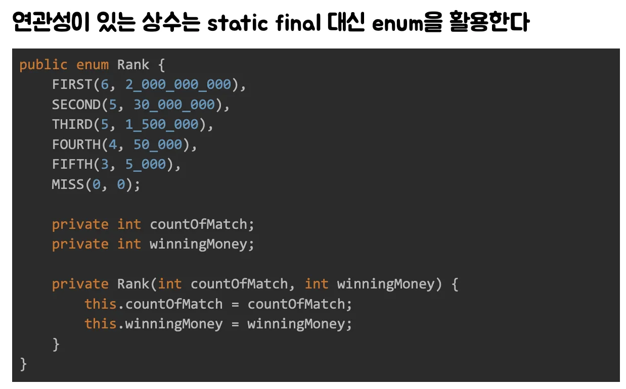 해당 피드백 내용으로 몇대 얻어맞은 뒤 연관된 상수를 Enum으로 묶을 생각을 해볼 수 있다.