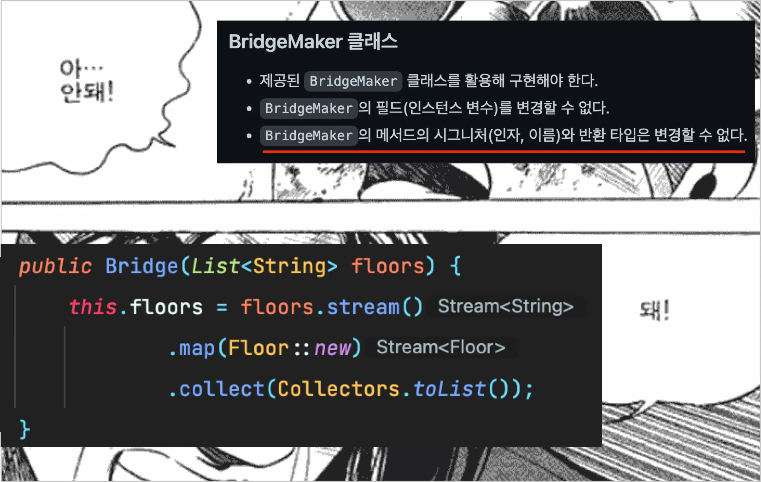 중간에 Bridge를 만드는데 생성자에서 int size를 받고 내부에서 BridgeMaker를 생성하고 알아서 만들어지게끔 구성하려고했다.