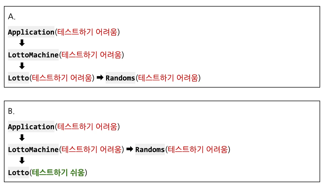 3주차 과제 공통피드백에서 위와같은 내용이 있었다. 한마디로 내가 하려던건 BridgeGame(테스트하기 어려움) -> Bridge(테스트하기 어려움) -> BridgeMaker (테스트하기 어려움)