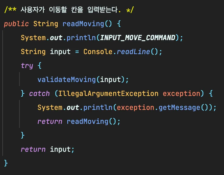 조건이 종료가 아닌 다시 입력받는 방식으로 변경되었다!! 지난 주차에 Application 메인 부분에 try - catch로 냅다 잡아버린게 마음에 들지 않았던걸까…