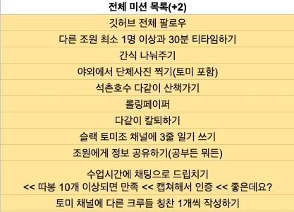 데일리 팀원들이 서로 친해질 수 있도록 다같이 다양한 미션들을 준비해보는 시간을 가졌어요! 레벨 2동안 미션들을 수행하면서 데일리 팀원들과 많이 친해져봐야겠네요 👍