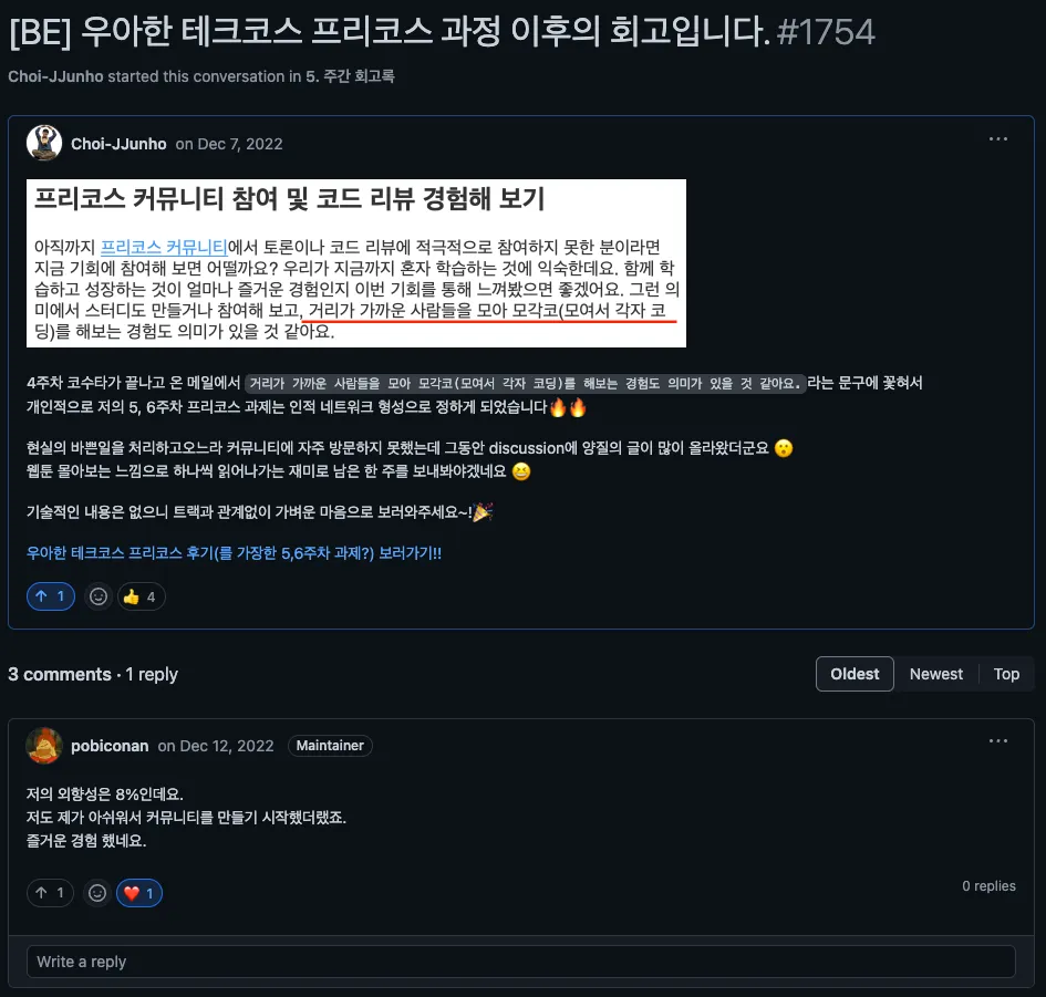 프리코스 코수타시간에 많이 뵙기도 했고, 무엇보다 프리코스 주간 회고록에 댓글로 공감해주셨던게 너무 좋았어서 내적친밀감이 엄청 쌓여있는 상태였답니다 🥹