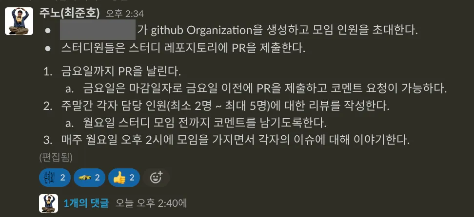 뭔가 모아놓고 방치해놓은거 같아 미안한 마음이 있었는데 7명중 3명이 따로 스터디를 하고 있다는것을 듣고 조금이나마 위안이 되었습니다. 🥹